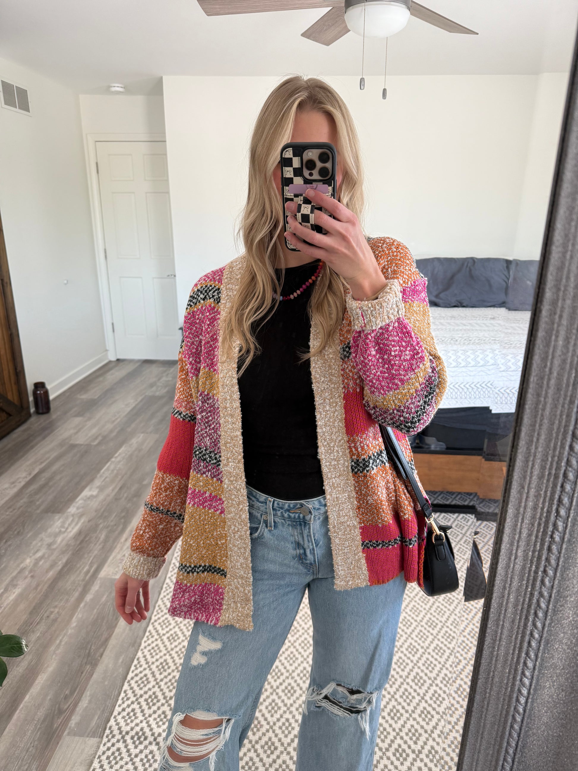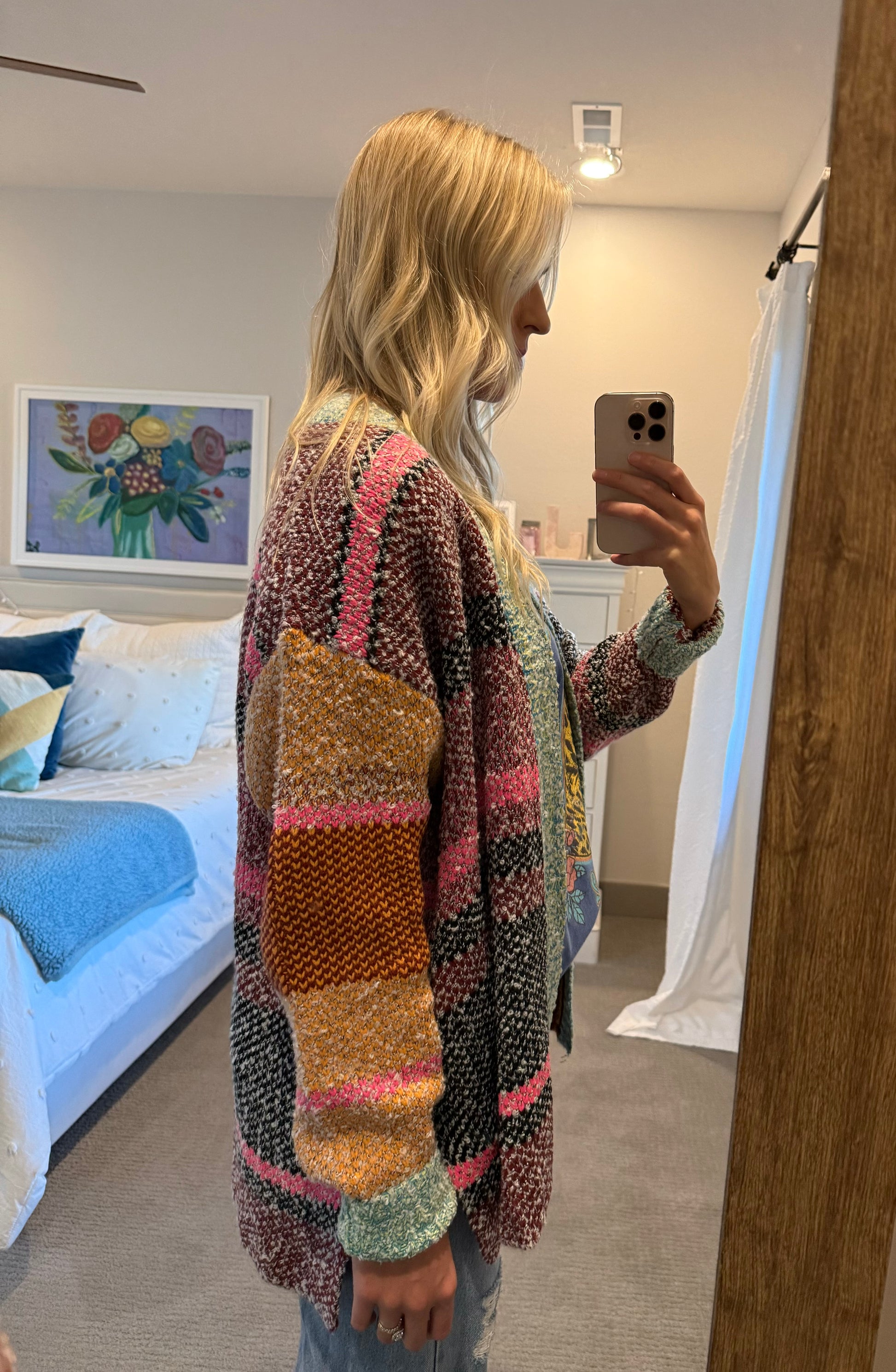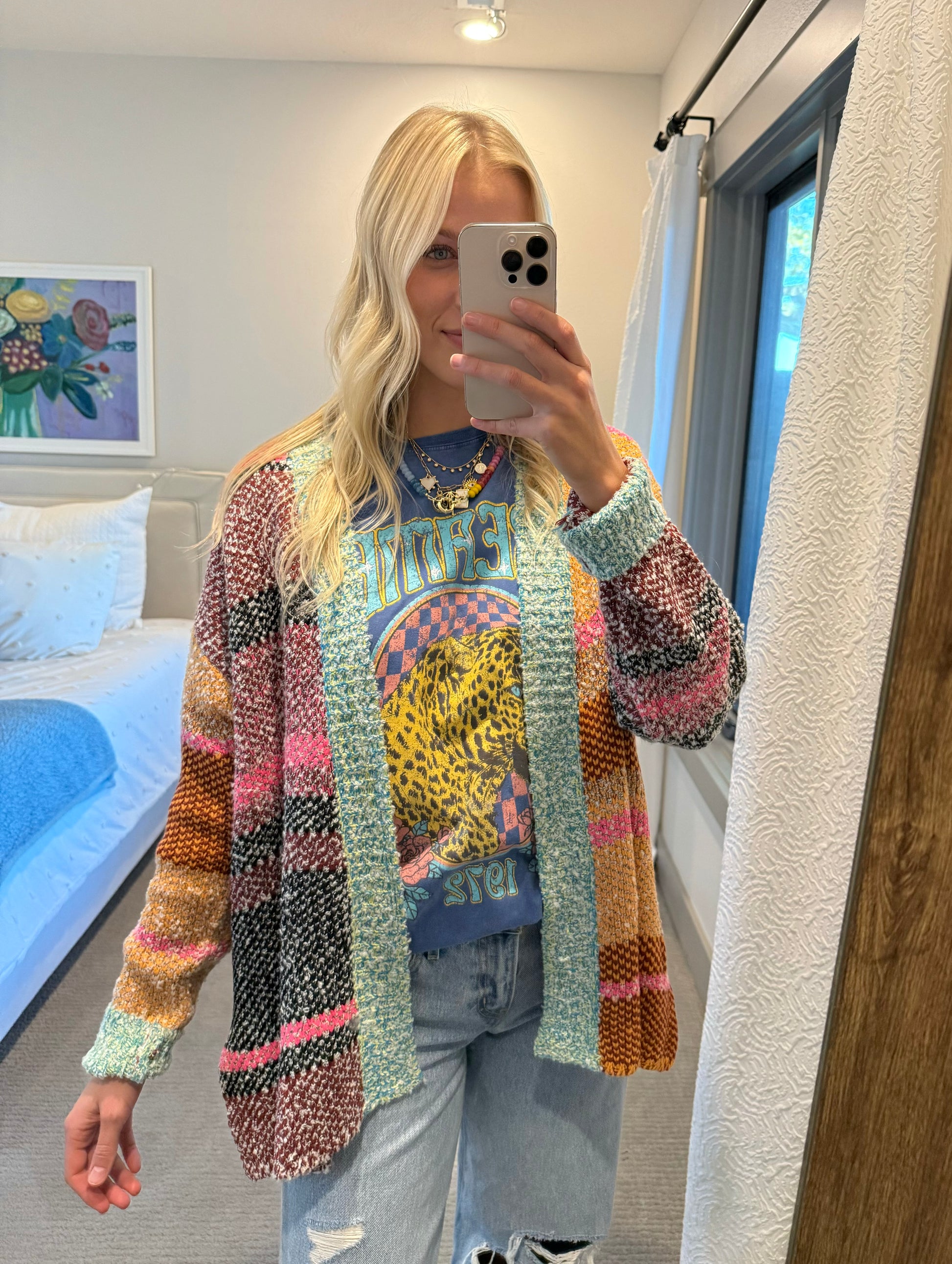 Discover the ultimate versatility with our colorful oversized cardigan, perfect for both days in the office and casual evenings. Enjoy the soft sweater material and the ease of transition from casual to dressy. You will love the soft material against your skin making it so cozy and comfortable you won't ever want to take it off.